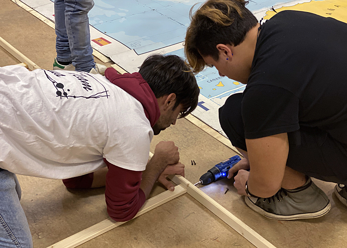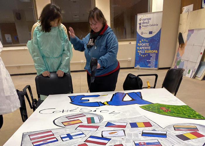 alla cittadinanza UE. Nel corso dell’esperienza laboratoriale sono state apprese le basi dell’arte scenografica teatrale come forma di comunicazione informale per superare ogni forma di barriera sociale. Due grandi pezzi di puzzle uno raffigurante la corona di 12 stelle della bandiera europea simbolo dell’unità e dell’identità di tutta l’Europa e l’altro un patchwork di bandiere a rappresentare i 26 stati membri dell’UE – si porgono la mano nell’ambito di uno spazio comune basato sui valori indivisibili e universali di dignità umana, di libertà, di uguaglianza e di solidarietà.